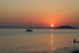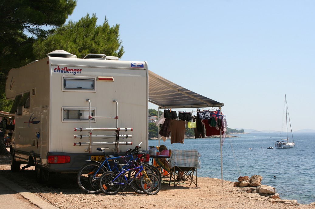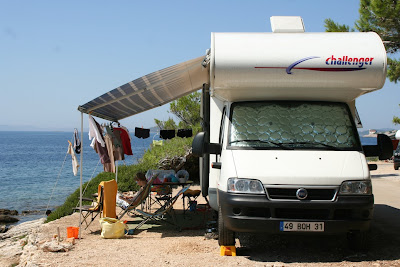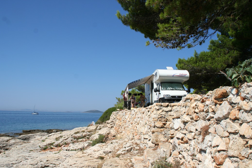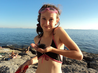 Là bas, une fois installé nous avons profité du coucher de soleil qui fut à droite de notre emplacement. En face nous avions des rochers avec la mer à quelques mètres. Nous avions un rocher qui servait de plongeoir pour tout le monde. Nous avions mon masque et mon tuba et nous avons pu voir les fonds marins alentours. On a vu des bancs de poisson, il y en avait des centaines, des oursins énormes. Bref notre séjour dans ce camping fut superbe.